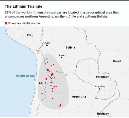 In the United States, plug-in electric vehicle (EV) sales increased 68.1 percent year-over-year from May 2022 to May 2023 for light-duty vehicles.[1] Current national policies devote billions of dollars towards EV charging infrastructure and set requirements for vehicles and battery component sourcing.[2, 3] One such component is lithium for the lithium-ion batteries. The majority of the lithium needed to build these batteries is found in the Lithium Triangle located at the intersection of South American countries Chile, Argentina, and Bolivia, with over half of the lithium reserves present in Argentina and Chile.[4] While there is incentive to source more lithium from the U.S. for use in EV batteries, lithium mines take years to set up and produce lithium, and would take an environmental toll on ecologies in the U.S.[5] Already established and developing mines in the Lithium Triangle are thus an inevitable source of the material at least in the near-term.